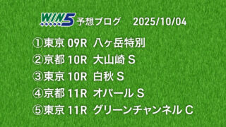 WIN5 WIN5予想 2025/10/04 オパールS 10月になりました。今月から年末にかけて何と土曜日もWIN5発売ということで、夢をつかむチャンスが増えました。資金をつないでいけるか心配ですが、頑張って予想していこうと思います。(オッズは前日22時現在) ①東京09R 八ヶ岳特別(芝180... 2025.10.03 WIN5