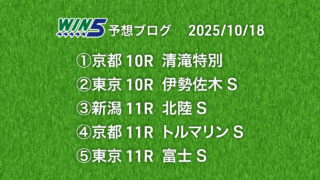 WIN5 WIN5予想 2025/10/18 富士S 予算が厳しいですが、今週も土曜からWIN5に挑戦します。まずは富士Sで秋華賞の資金稼ぎといきましょう。(オッズは当日12:30現在) ①京都10R 清滝特別(芝2200m)14:50発走 2点勝負 ◎②ジョイボーイ 1人気1着◯⑥リギーロ ... 2025.10.18 WIN5