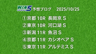 WIN5 WIN5予想 2025/10/25 アルテミスS 今日のメインは阪神JFの前哨戦・アルテミスS。2歳重賞は先日のサウジアラビアRCで痛い目に遭ったので静観したいところですが、菊花賞の資金を稼ぎたいので頑張ります。 ①京都10R 長岡京S(芝1400m)14:50発走 3点勝負 ◎⑤スリール... 2025.10.25 WIN5