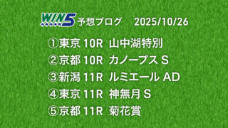 WIN5 WIN5予想 2025/10/26 菊花賞(WIN5初的中!) 今週は牡馬クラシックの最終戦・菊花賞が行われます。春二冠を勝ったミュージアムマイルやクロワデュノールがいないのは寂しいですが、馬券的には面白そうな一戦ですね。 ①東京10R 山中湖特別(芝1800m)14:50発走 2点勝負 ◎⑥クリニクラ... 2025.10.26 WIN5