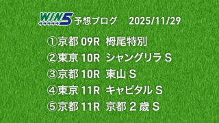 WIN5 WIN5予想 2025/11/29 京都2歳S 11月もあっという間に最終週になりました。明日のジャパンカップをもって今年の東京開催も終了ですね。今日は年末のホープフルSを占う上で重要な京都2歳Sが行われます。ここを当てて12月に向けて弾みをつけたいところです。 ①京都9R 栂尾特別(ダ... 2025.11.29 WIN5