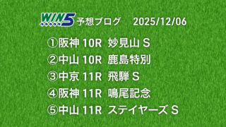 WIN5 WIN5予想 2025/12/06 鳴尾記念 12月に入りました。11月は全く冴えなかったので最後はプラスで終えたいものです。今日は中山でマラソンレースのステイヤーズS、阪神ではコロコロ施行条件が変わる鳴尾記念が行われます。有馬記念につながるかは微妙ですが、両重賞共しっかり見届けたいで... 2025.12.06 WIN5