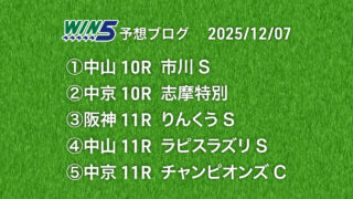 WIN5 WIN5予想 2025/12/07 チャンピオンズC 今日は下半期のダート王を決めるチャンピオンズC。活きの良い3歳馬や牝馬が上位人気を賑わせて、世代交代なるか注目が集まります。 ①中山10R 市川S(芝1200m)14:50発走 2点勝負 ◎⑤クラウンシエンタ◯⑭ファリーザ▲①ゴールドアロー... 2025.12.07 WIN5
