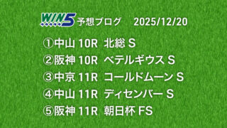 WIN5 WIN5予想 2025/12/21 朝日杯FS 今日は2歳マイル路線のチャンピオンを決める朝日杯FS。無敗馬も多く人気が拮抗しておりますが、上位人気だけに絞ると期待値が低いし、馬券の組み立てに苦労しています。 ①中山10R 北総S(ダ1800m)14:50発走 2点勝負 ◎⑬ヴァナルガン... 2025.12.21 WIN5