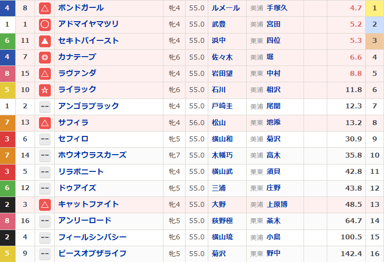 コース実績を重視してカナテープとアドマイヤマツリが中心。府中牝馬Sを勝ったセキトバイーストと、そろそろ来てもおかしくないライラックにも注意。