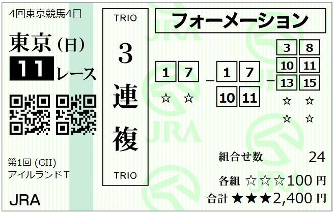⑤東京11R アイルランドT(GⅡ・芝1800m)15:45発走 1点勝負&三連複