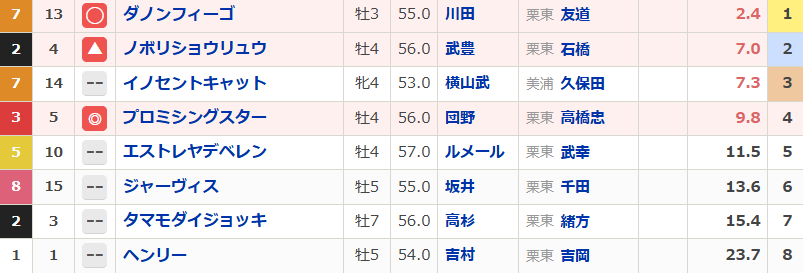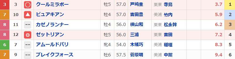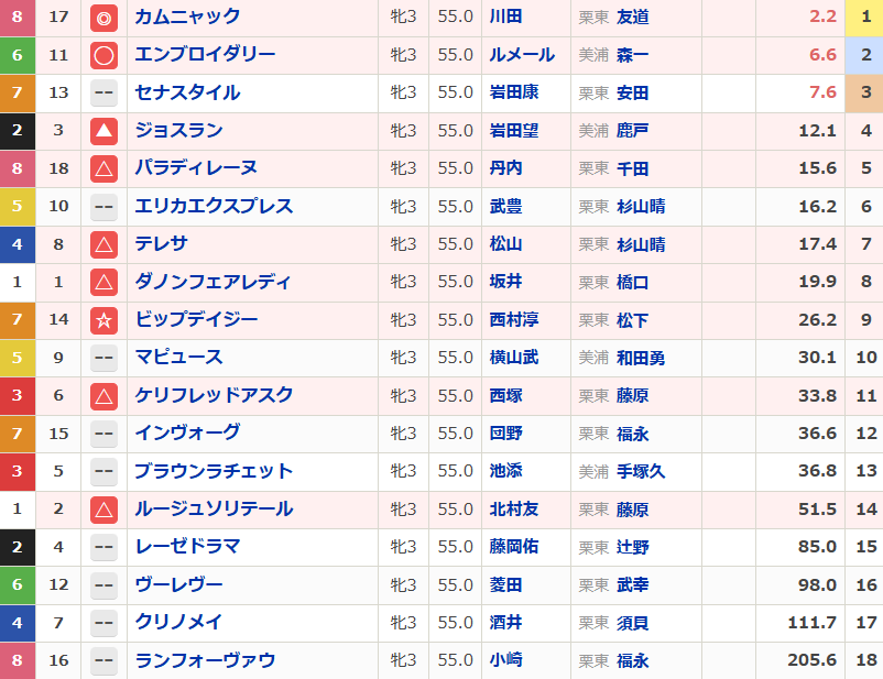 前哨戦の結果を見るとカムニャックの二冠濃厚、展開に紛れがあっても3着は外さないと見ますが、果たして。距離不安も囁かれるエンブロイダリーですが、地力の違いで上位には来るはず。但し人気2頭の1・2着は妙味がないので、三連単は1・3着流しで間に大穴が挟まってくれるのを期待して久々に禁断の「全」で攻めます。