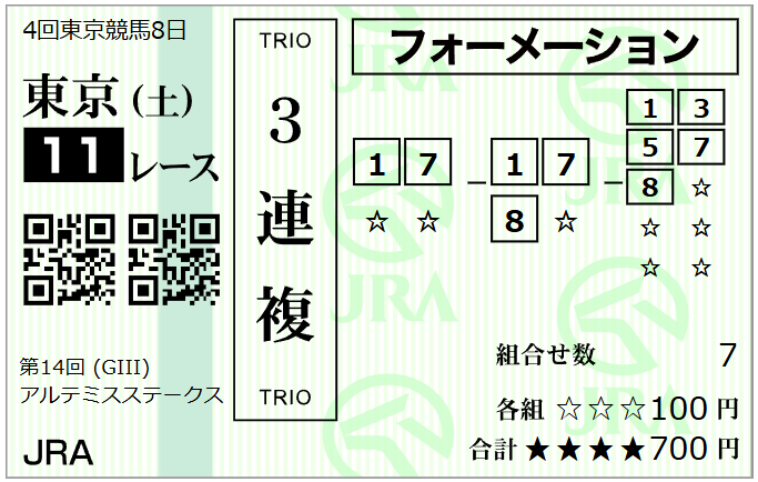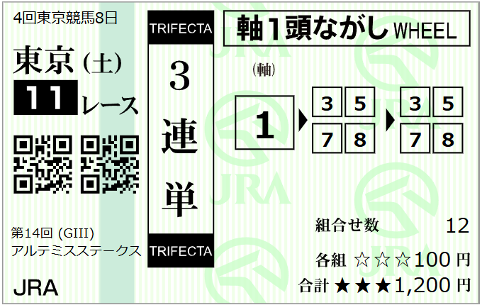 ⑤東京11R アルテミスS(GⅢ・芝1600m)15:45発走 1点勝負
