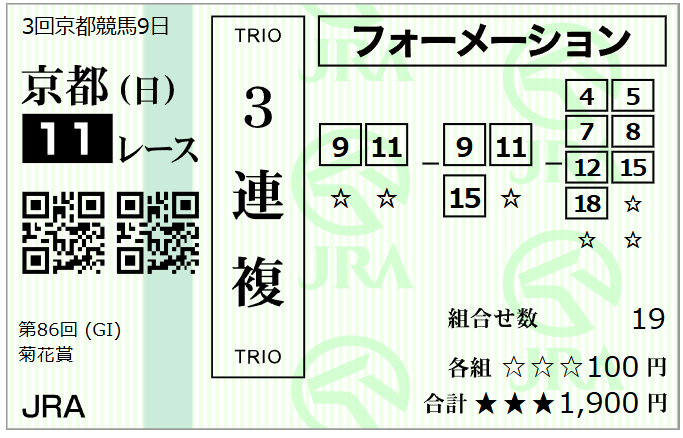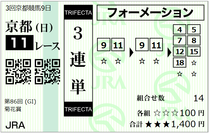 ⑤京都11R 菊花賞(GⅠ・芝3000m)15:40発走 1点勝負&三連複・三連単