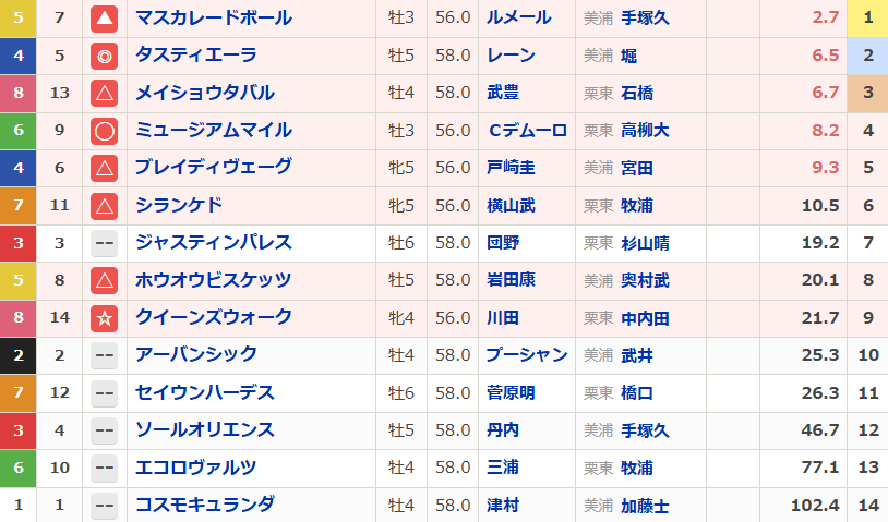 悩んだ挙げ句、外国人J重視の印になりました。マスカレードボールは通用するとは思うものの、ルメール人気も手伝って過剰気味。それなら昨年2着のタスティエーラを本命に。ただもう少し人気ないかと思っていたので2人気はちょっと意外。コース適性が疑われるミュージアムマイルですが、ひと叩きして順調なのは強み。前走放馬による除外のせいか人気の盲点になっているクイーンズウォークも要注意。