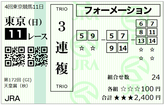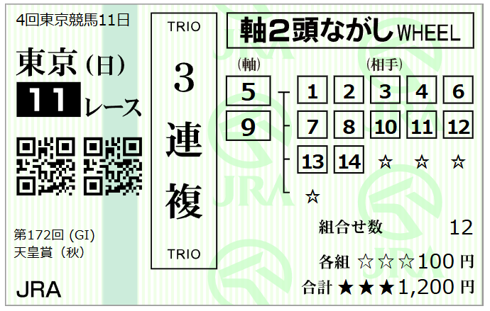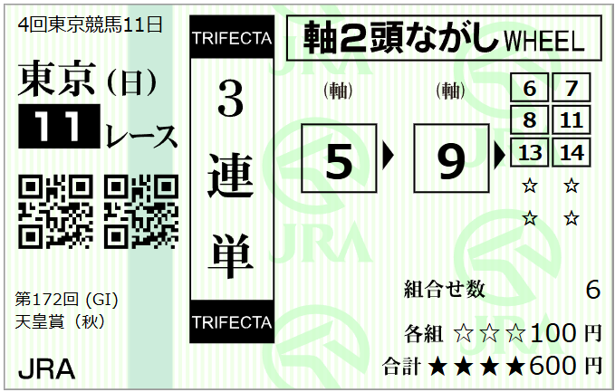 ⑤東京11R 天皇賞(秋)(GⅠ・芝2000m)15:40発走 1点勝負&三連複・三連単