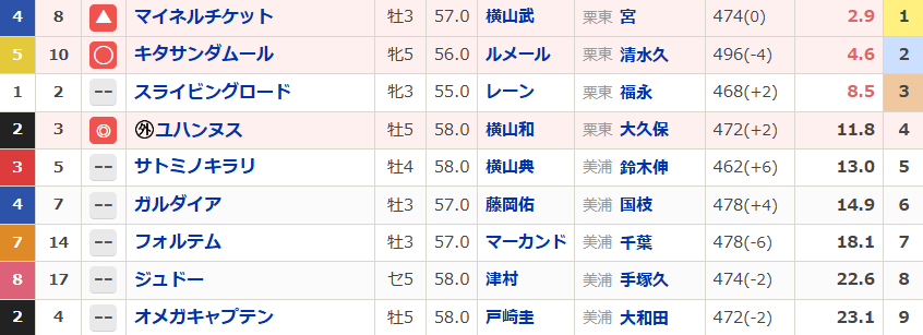 惜敗続きのマイネルチケットがそろそろという気もしつつ、ここは2点勝負で前走同コースで2着のユハンヌスと、ルメール騎乗のキタサンダムールに期待します。