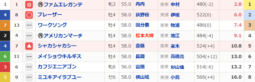 未勝利戦ながら同コースで圧勝の経験もあるファムエレガンテが本命。予算的に1点勝負しかできないけど、持ち時計で勝るブレーザーとシャカシャカシーが逆転候補。